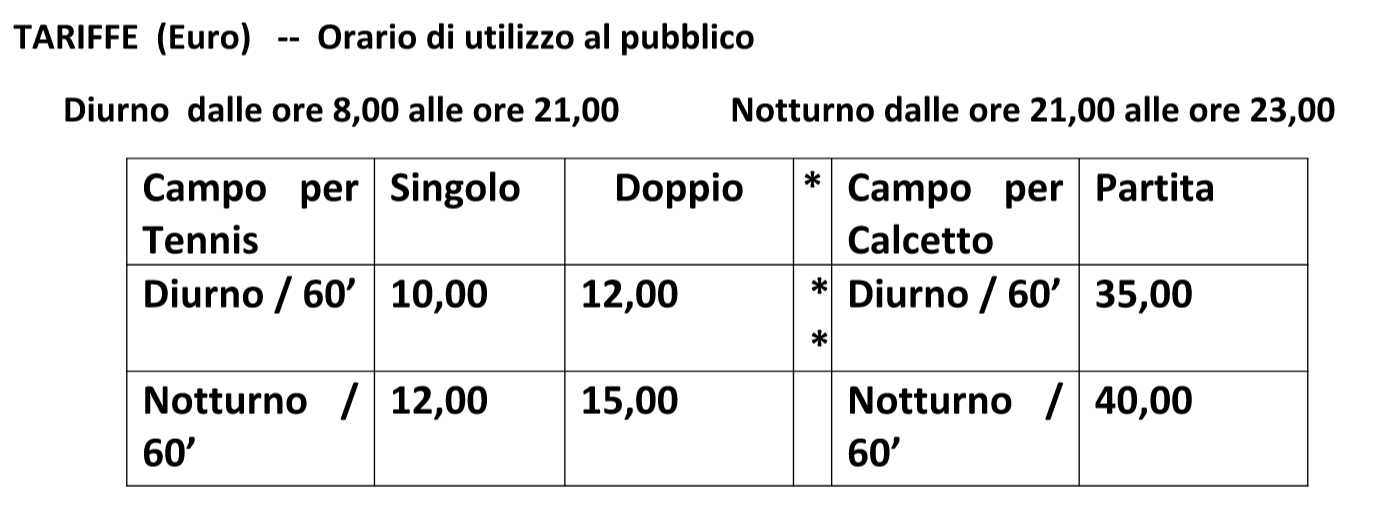 10. Si raccomanda ai giocatori l’utilizzo di scarpe a suola liscia, idonee per il tennis e il calcetto. La Direzione non fornisce racchette e palle da tennis, nemmeno palloni per il calcetto.